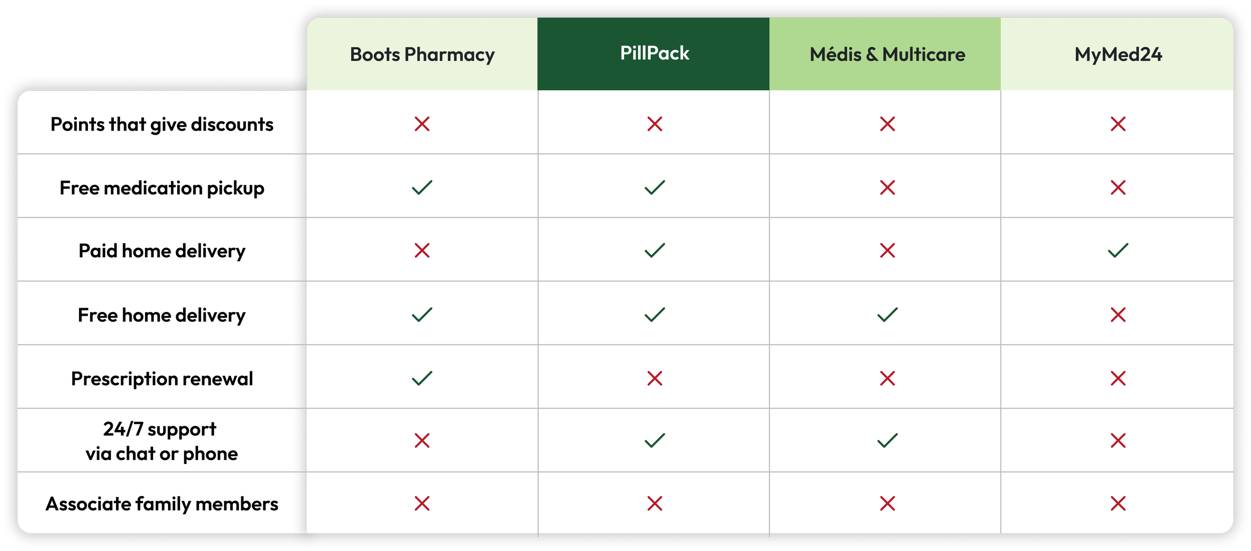 We analyzed national and international competitors such as Boots, PillPack, Médis & Multicare, and MyMed24. The comparison revealed a fragmented offer, with few services combining convenience, accessibility, and added value. These insights helped identify gaps and opportunities for the Saúda subscription plans.