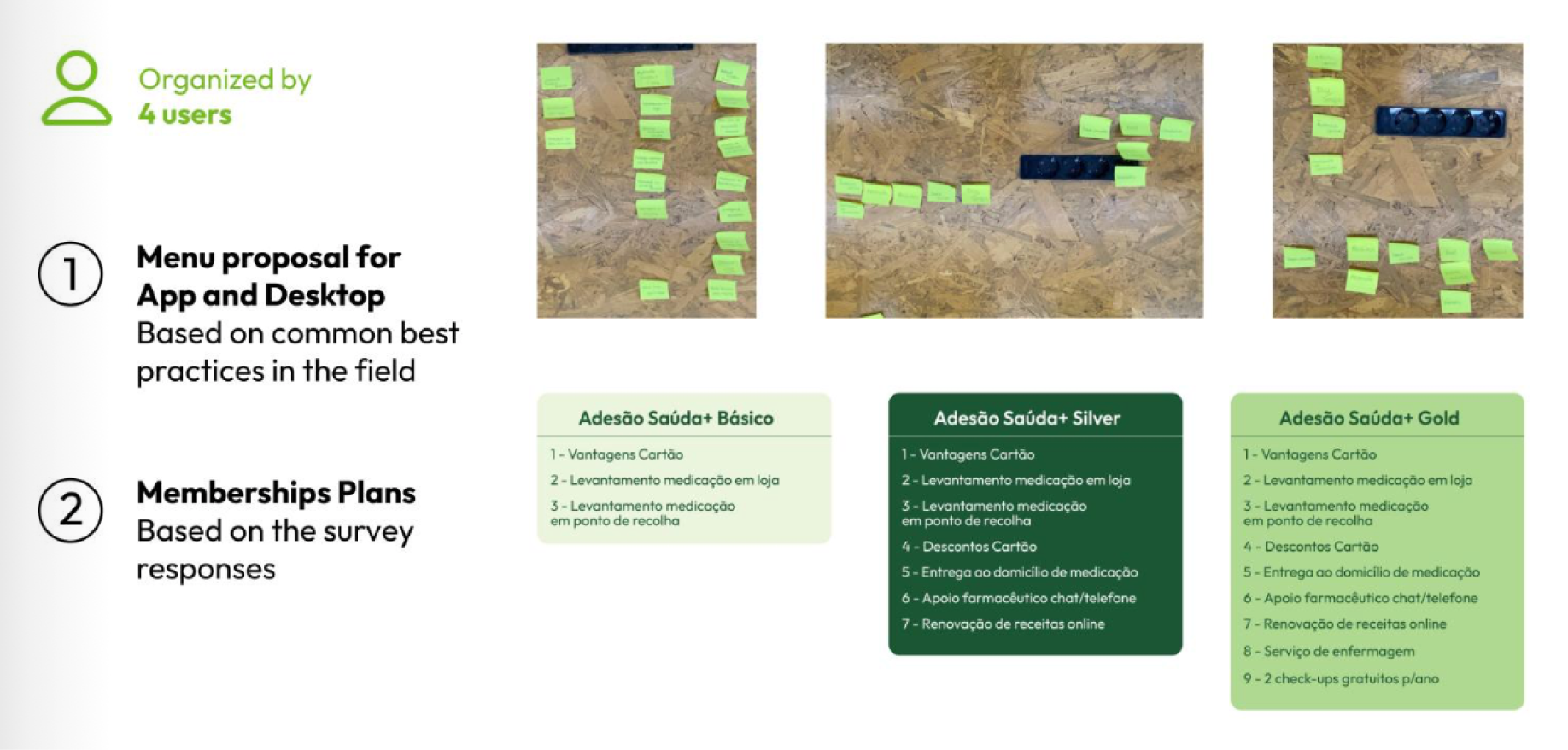 We conducted a card sorting exercise with 4 users to organize the menu structure for both app and desktop. This activity helped validate common best practices while also shaping the Saúda+ membership plans. Based on survey insights, the final proposal included three levels of subscription, Basic, Silver, and Gold, each tailored to different user needs and expectations.