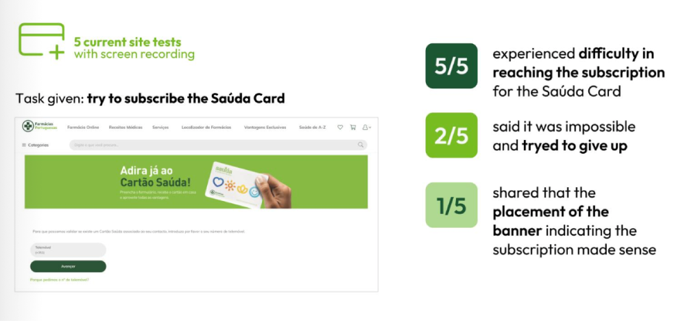 To complement these findings, we carried out 5 usability tests with screen recording on the current Saúda Card subscription process. All participants (5/5) reported difficulties reaching the subscription page, with 2/5 considering giving up entirely. Only 1/5 felt that the banner placement for the subscription made sense. These results highlighted clear usability problems and confirmed the importance of redesigning the digital experience.