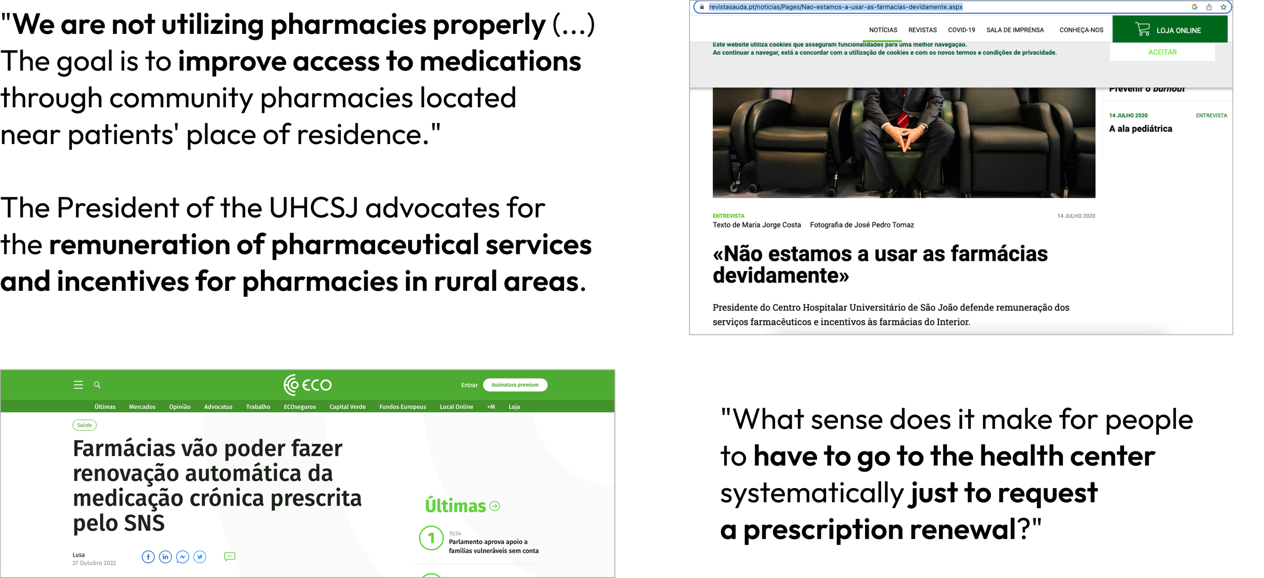 The project began with an evaluation of the role of Farmácias Portuguesas as a 100% Portuguese product and their relevance within the healthcare ecosystem. We explored their potential by analyzing accessibility, geographic coverage, and the wide range of services already offered to citizens.