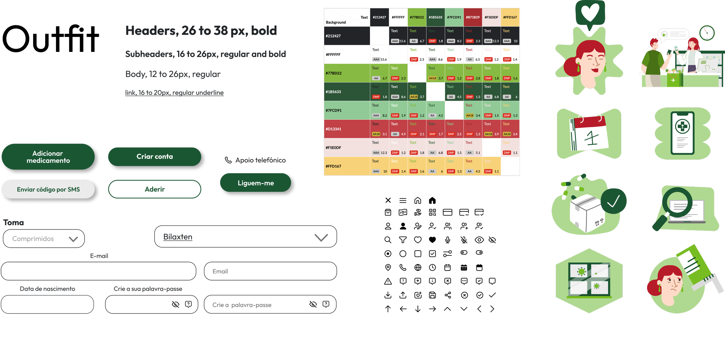 The UI Kit was developed to ensure consistency and accessibility across the platform. It included typography guidelines using the Outfit font, a complete color palette tested for accessibility, reusable components such as buttons and form fields, and a custom icon set. In addition, a series of illustrations was designed to support the visual identity, making the interface more engaging and user-friendly.