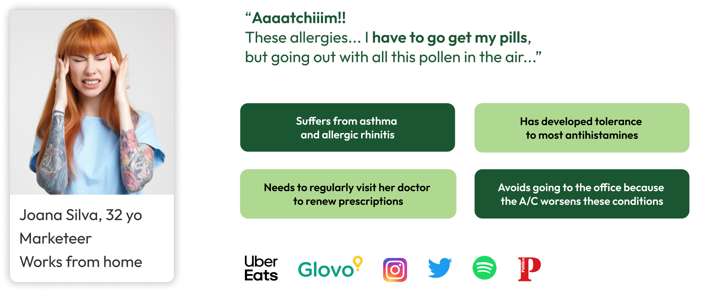 To better empathize with users, we created the persona Joana Silva, a 32-year-old marketeer who works from home and struggles with asthma and allergic rhinitis. Joana frequently needs prescription renewals and experiences discomfort when leaving the house, especially during allergy season.
