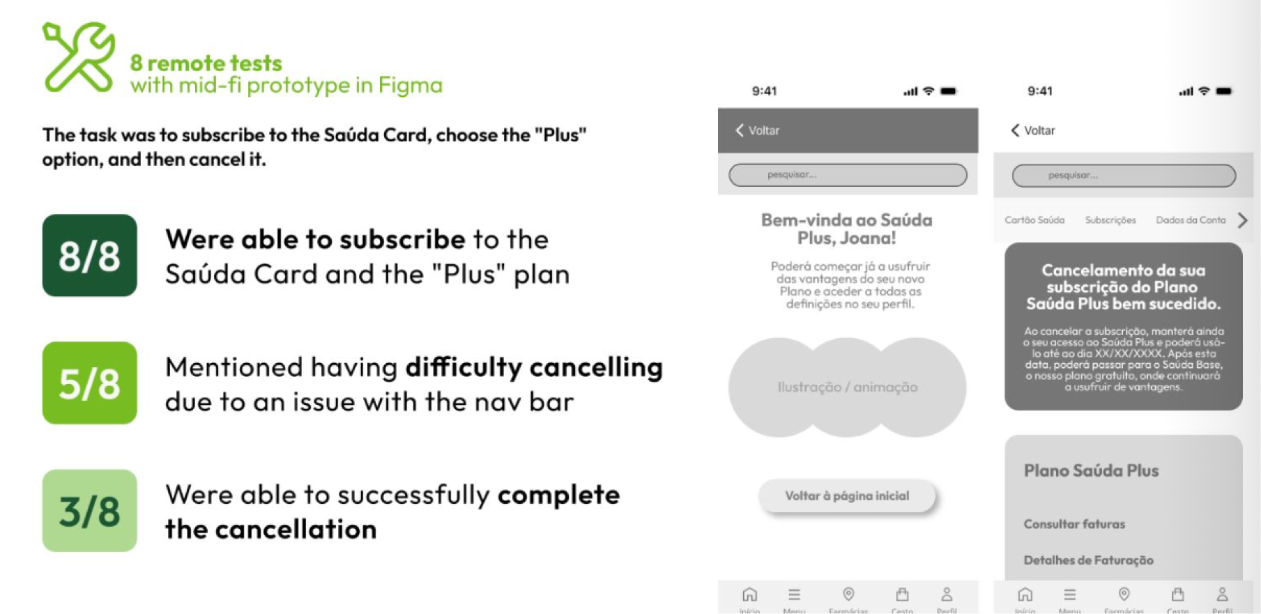We conducted 8 remote usability tests with the mid-fidelity prototype in Figma. All participants (8/8) were able to subscribe to the Saúda Card and the “Plus” plan. However, 5/8 reported difficulties when trying to cancel due to navigation bar issues, and only 3/8 successfully completed the cancellation process.