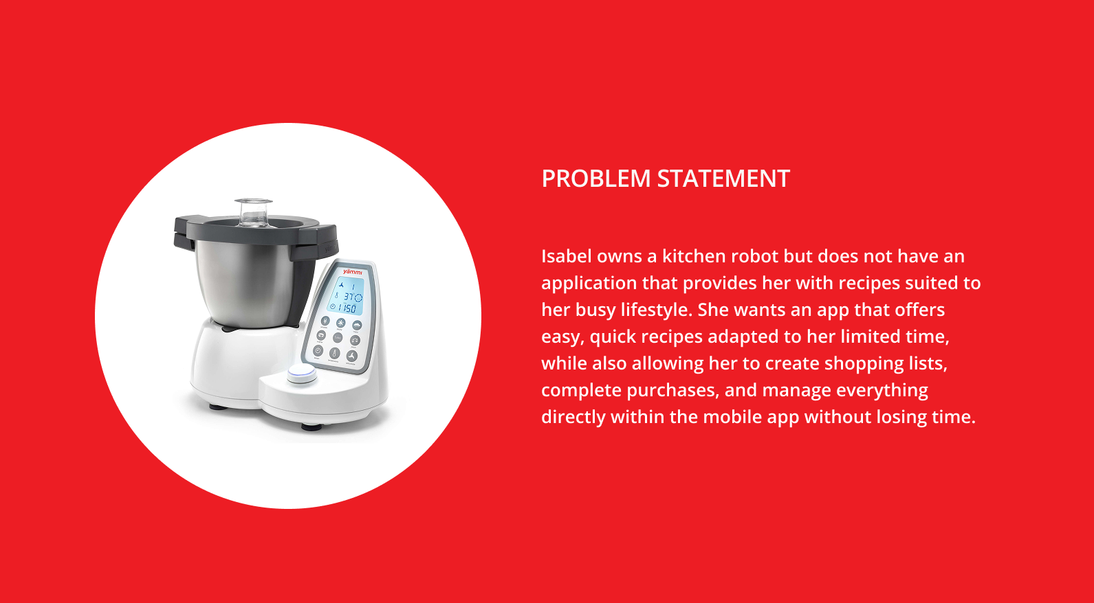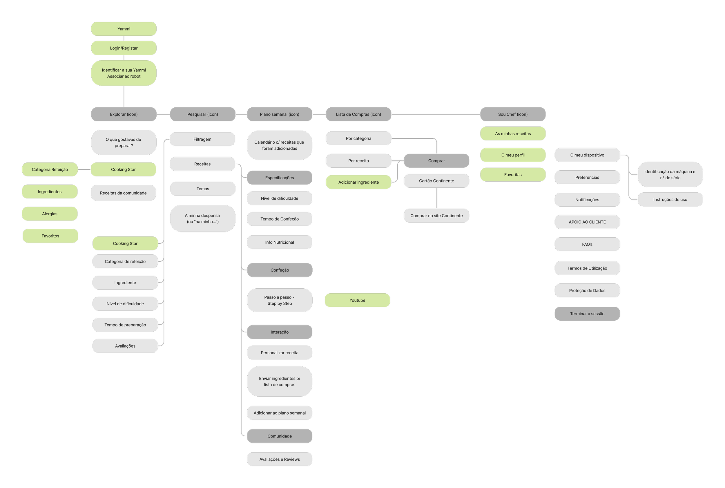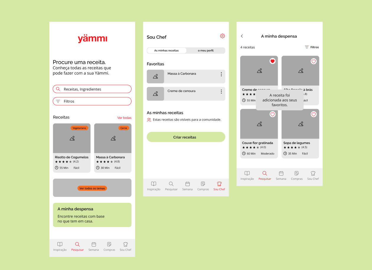The project focused on designing a mobile app for Yämmi, aiming to extend the cooking robot’s value through digital features. The app was conceived to simplify users’ daily routines by integrating recipe search, pantry management, and a shopping list connected to Continente Online.