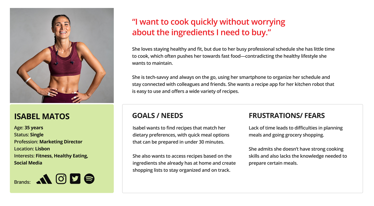 By analyzing the apps and brands this user already interacts with, we identified usability patterns and behaviors that she is familiar with. These insights allowed us to define a persona and apply recognizable interaction models, ensuring the new app design would feel intuitive and aligned with her expectations.