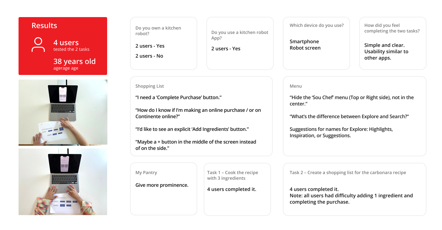 To validate the proposed solutions, we conducted usability tests with four users, who performed two predefined tasks. The average age of participants was 38 years old, and their profiles varied between current kitchen robot owners and non-owners. The tests helped us identify key improvement opportunities, such as the need for a clearer shopping list flow and better prominence for certain features like “My Pantry.”