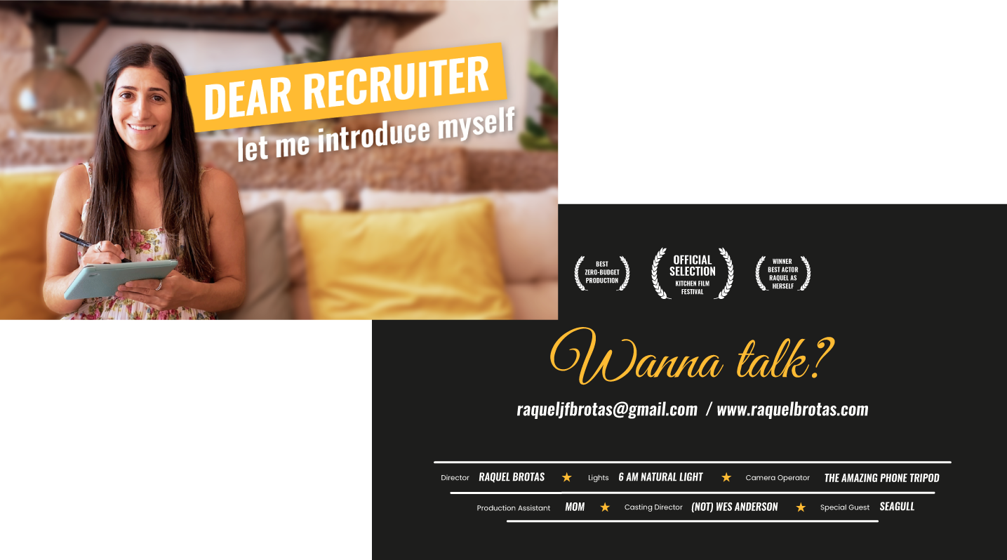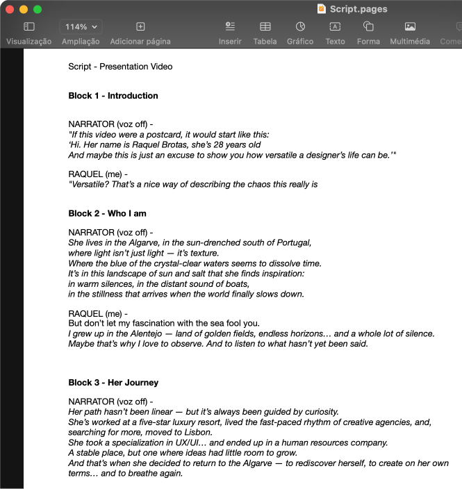 The main challenge was to translate something as intangible as personality into a structured and engaging format. I wanted the video to show not only my design thinking and storytelling skills but also to manage expectations between myself and future employers. This meant finding the right balance between personal storytelling and professional positioning, ensuring the video communicated my essence, while also demonstrating that I could be a strong cultural and creative fit for a team.