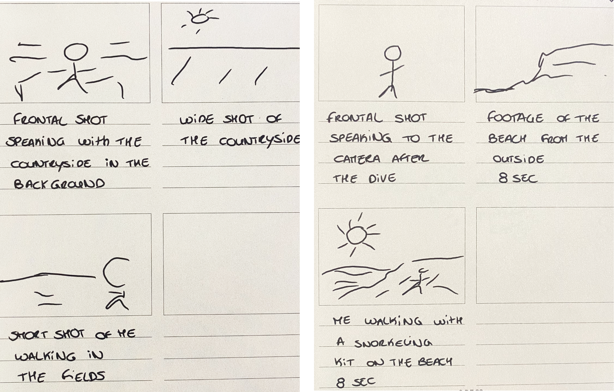 After shaping the script, I moved on to building a detailed storyboard for each block of the video. I defined all the locations where I wanted to shoot and organized the filming schedule by separating each day according to the chosen setting. To maintain consistency in light and atmosphere, I planned the recordings at the same time of day, around 6:30 AM, when the first sunlight begins to appear.