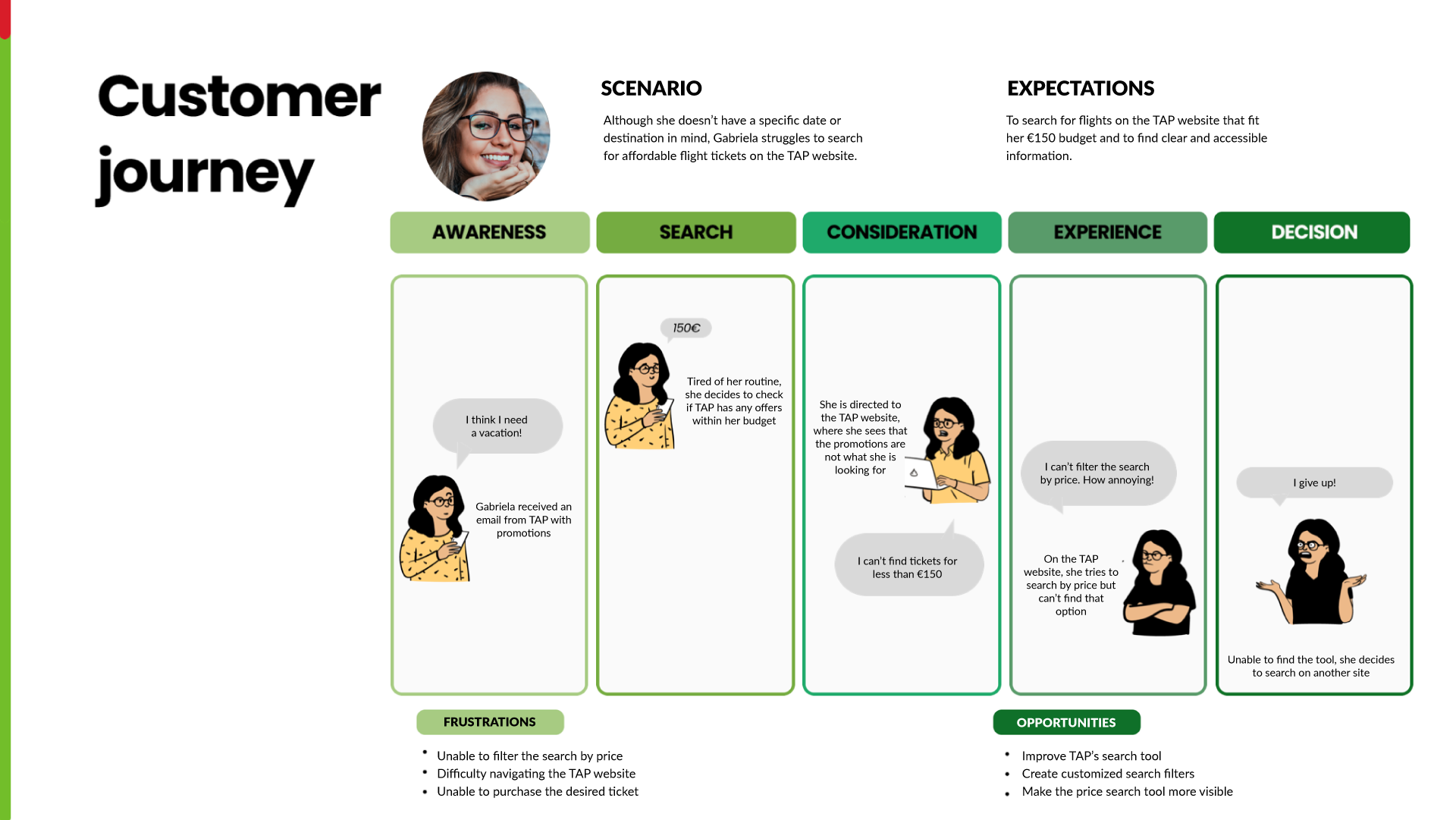 The customer journey mapped Gabriela’s experience when searching for flights on the TAP website. Despite receiving promotional emails, she faced difficulties finding offers that matched her budget and struggled with the lack of clear price filters.