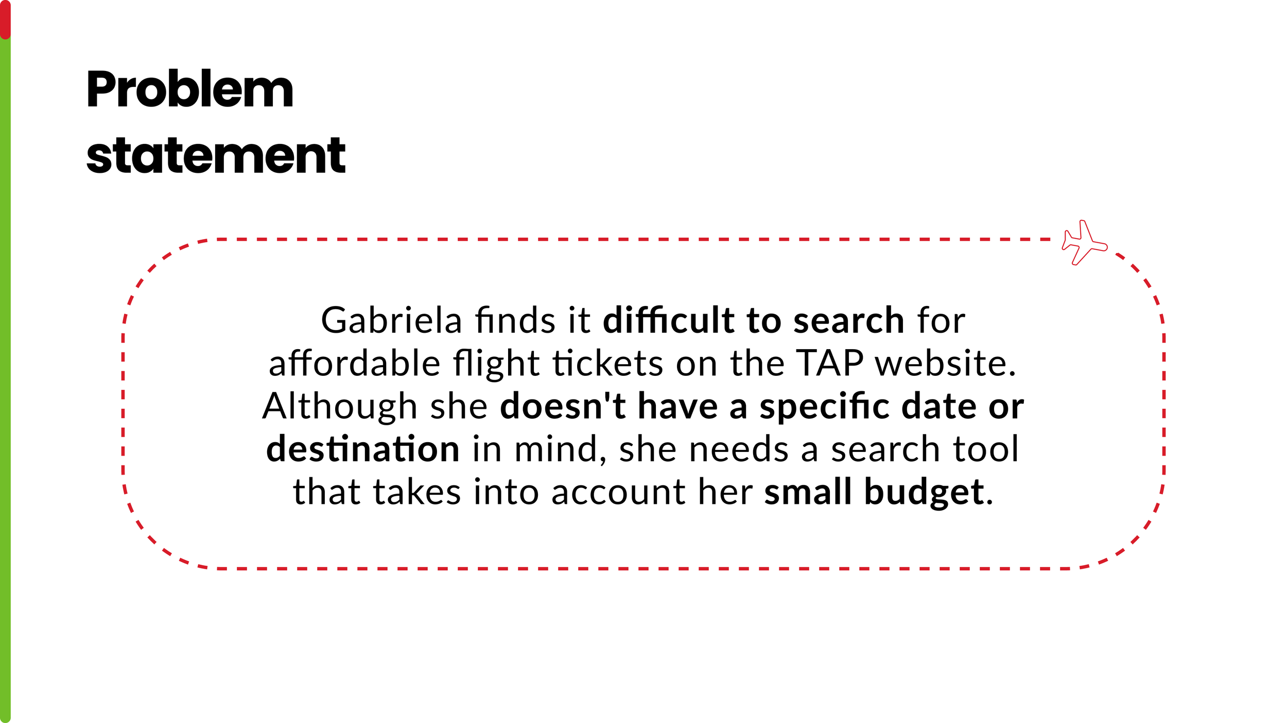 Our research revealed that many users, like Gabriela, struggle to find affordable flight options on the TAP website when they don’t have a fixed date or destination in mind. This highlighted a gap in the search experience, where budget and flexibility are not fully supported, reinforcing the need for a more intuitive and adaptive search tool.