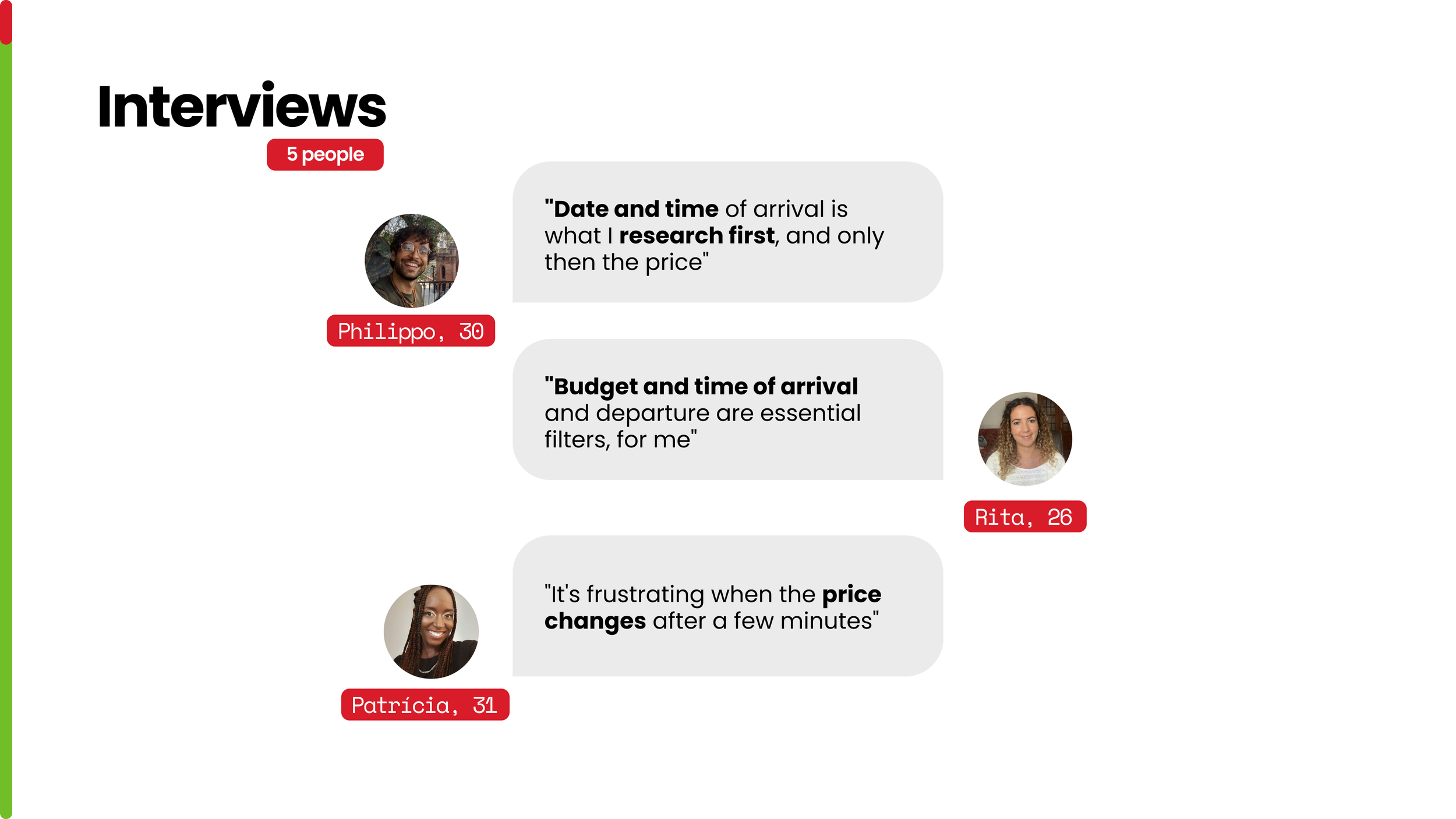 To complement the survey results, we conducted five interviews to gain deeper qualitative insights into users’ frustrations and priorities when booking flights.