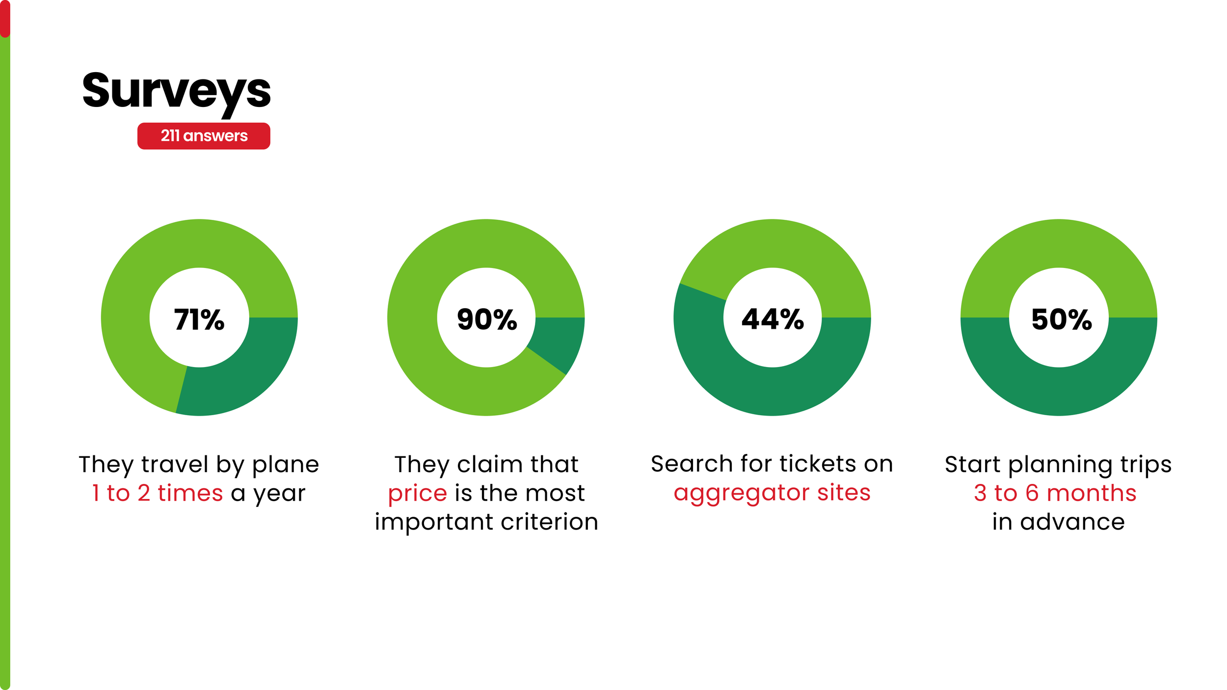 To validate our design decisions, we conducted a survey with 211 respondents, which revealed valuable insights into users’ travel behaviors. Most participants travel by plane 1 to 2 times a year, with 90% stating price as the most important criterion. Additionally, 44% prefer searching for tickets on aggregator sites, and half of them start planning trips 3 to 6 months in advance.