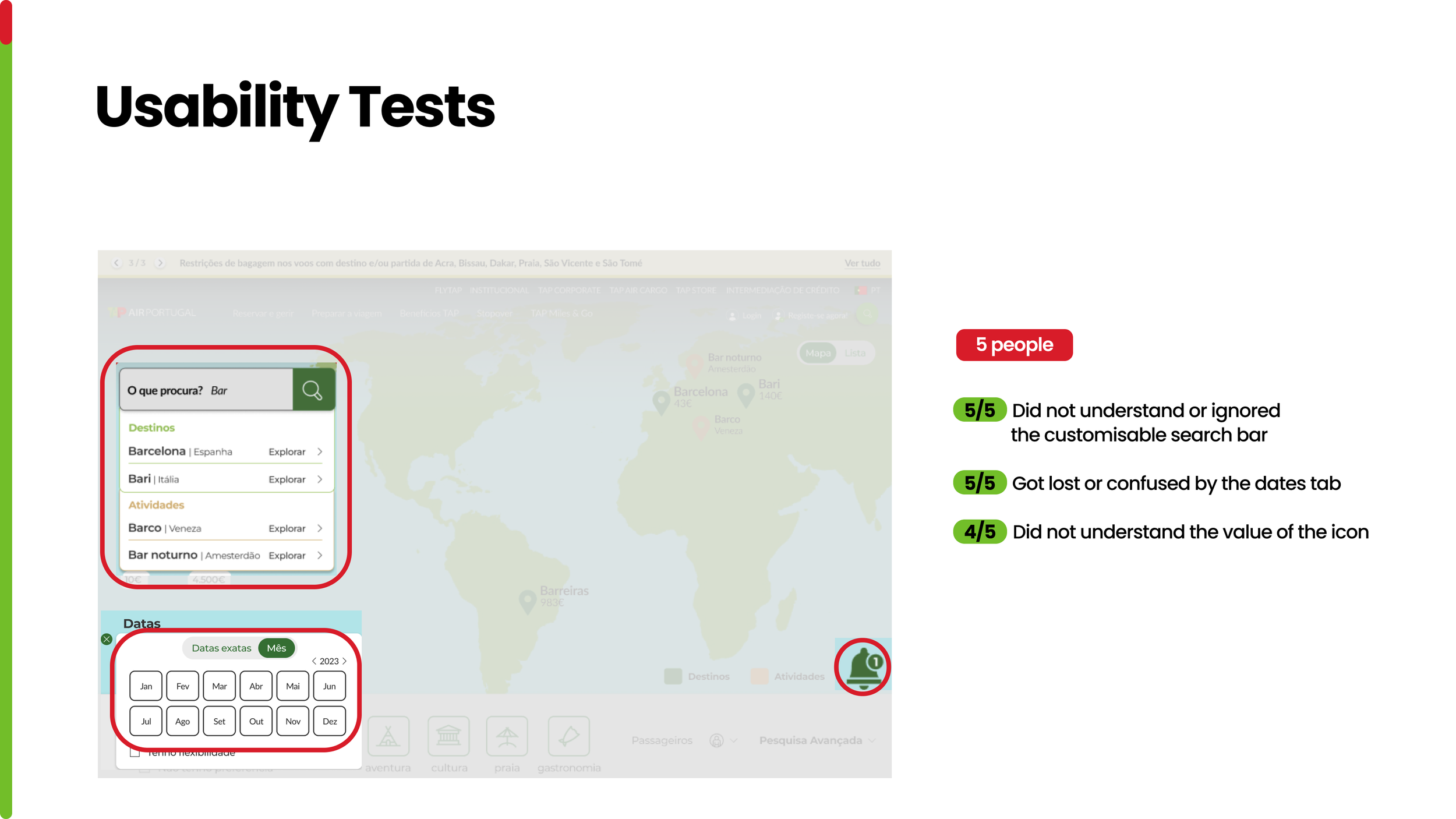 To validate our prototype, we conducted usability tests with five participants. The results revealed recurring issues: all users struggled to understand or completely ignored the customizable search bar, and all of them got confused when navigating the dates tab. Additionally, most participants (4 out of 5) did not understand the purpose of the icon.